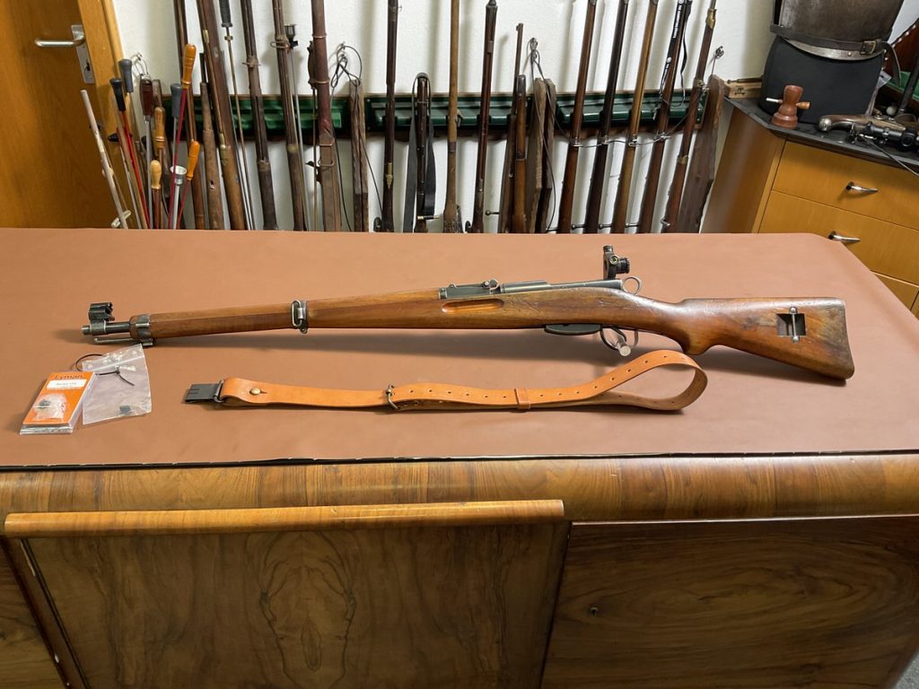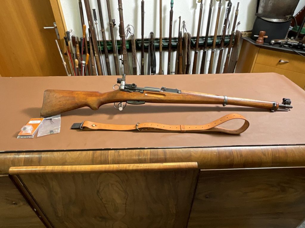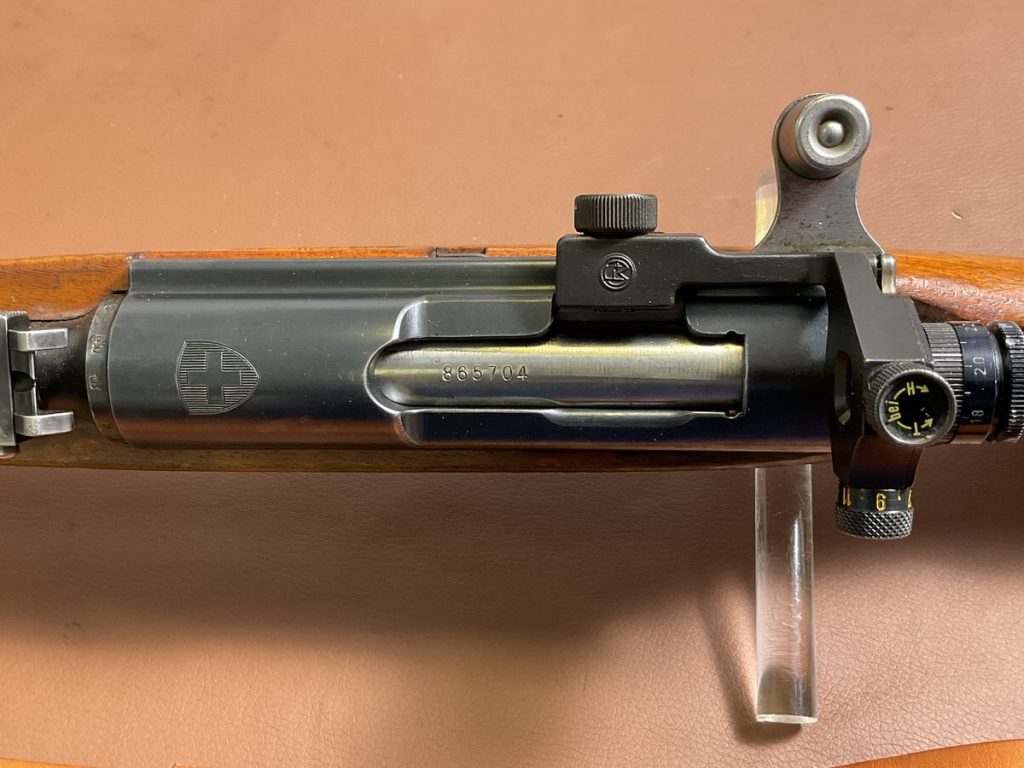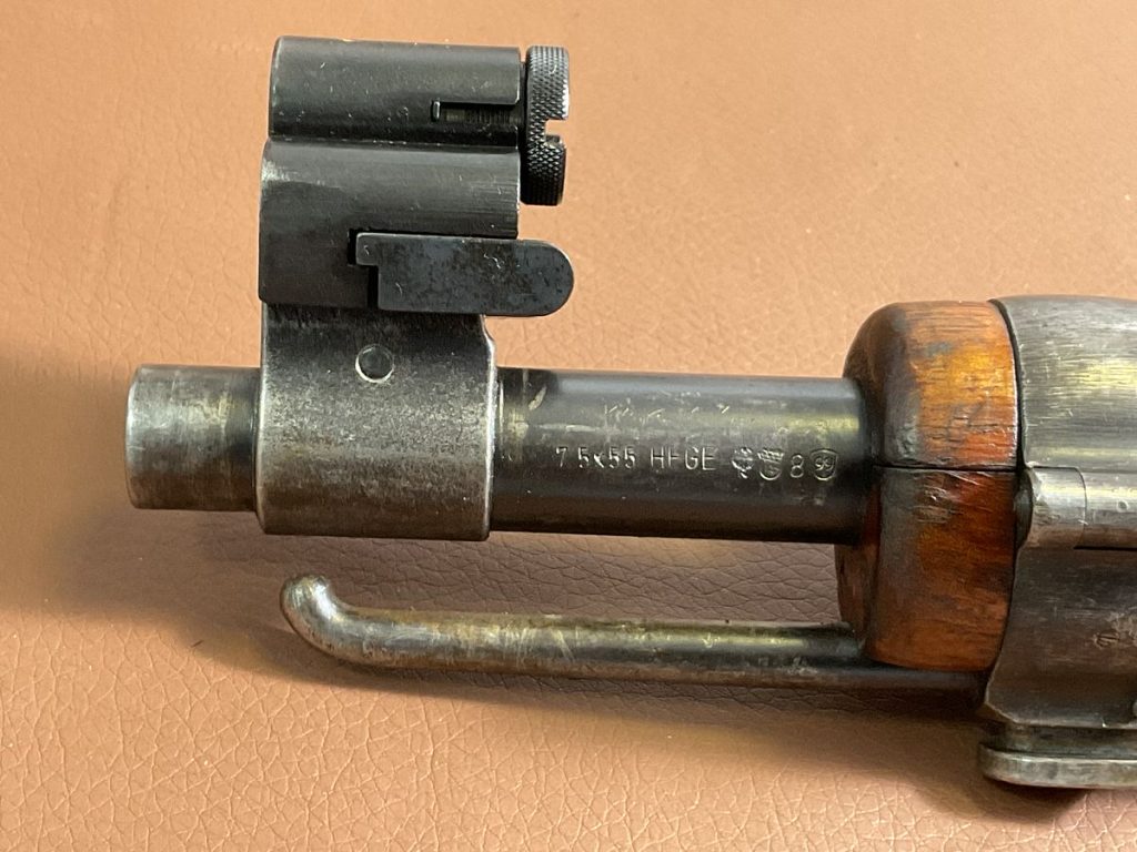 zum Verkauf steht eine technisch sehr gut erhaltene Repetierbüchse mit Diopter im Kaliber 7,5×55 Swiss