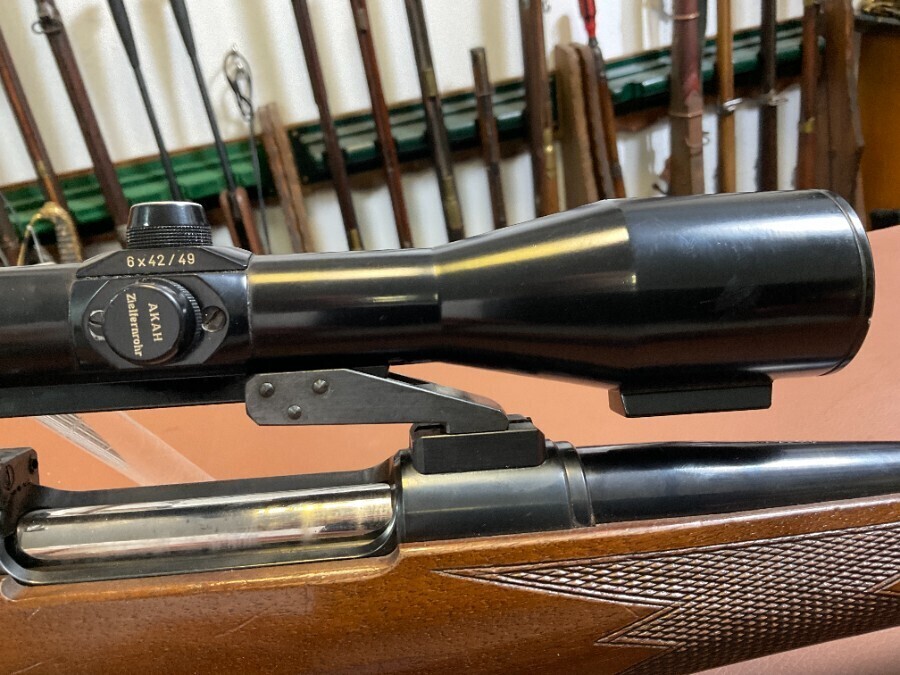 Montiert ist ein Zeiss-Zielfernrohr Diatal Z 6–42 (Absehen 4) auf fester Suhler Einhakmontage (spielfrei).