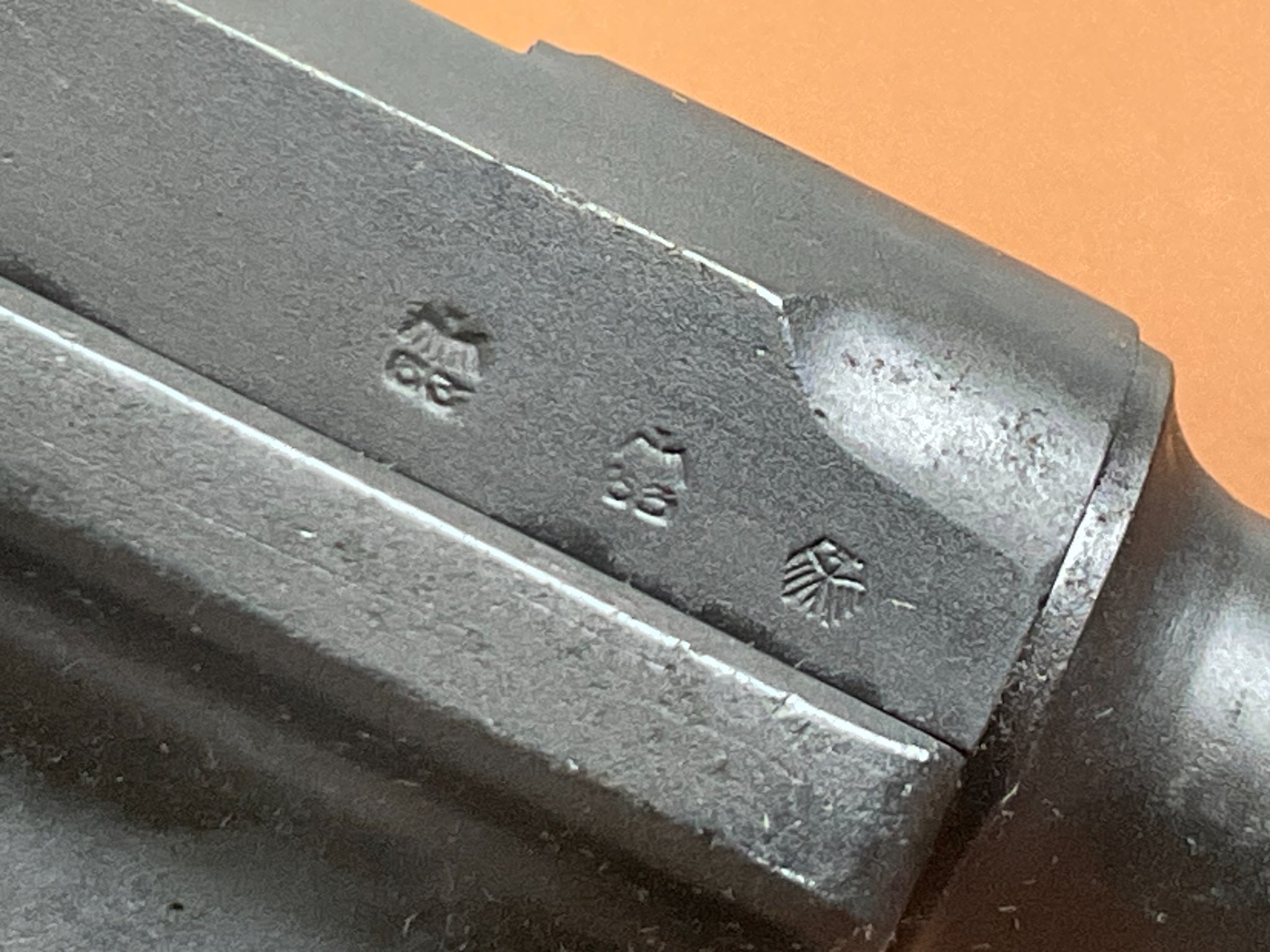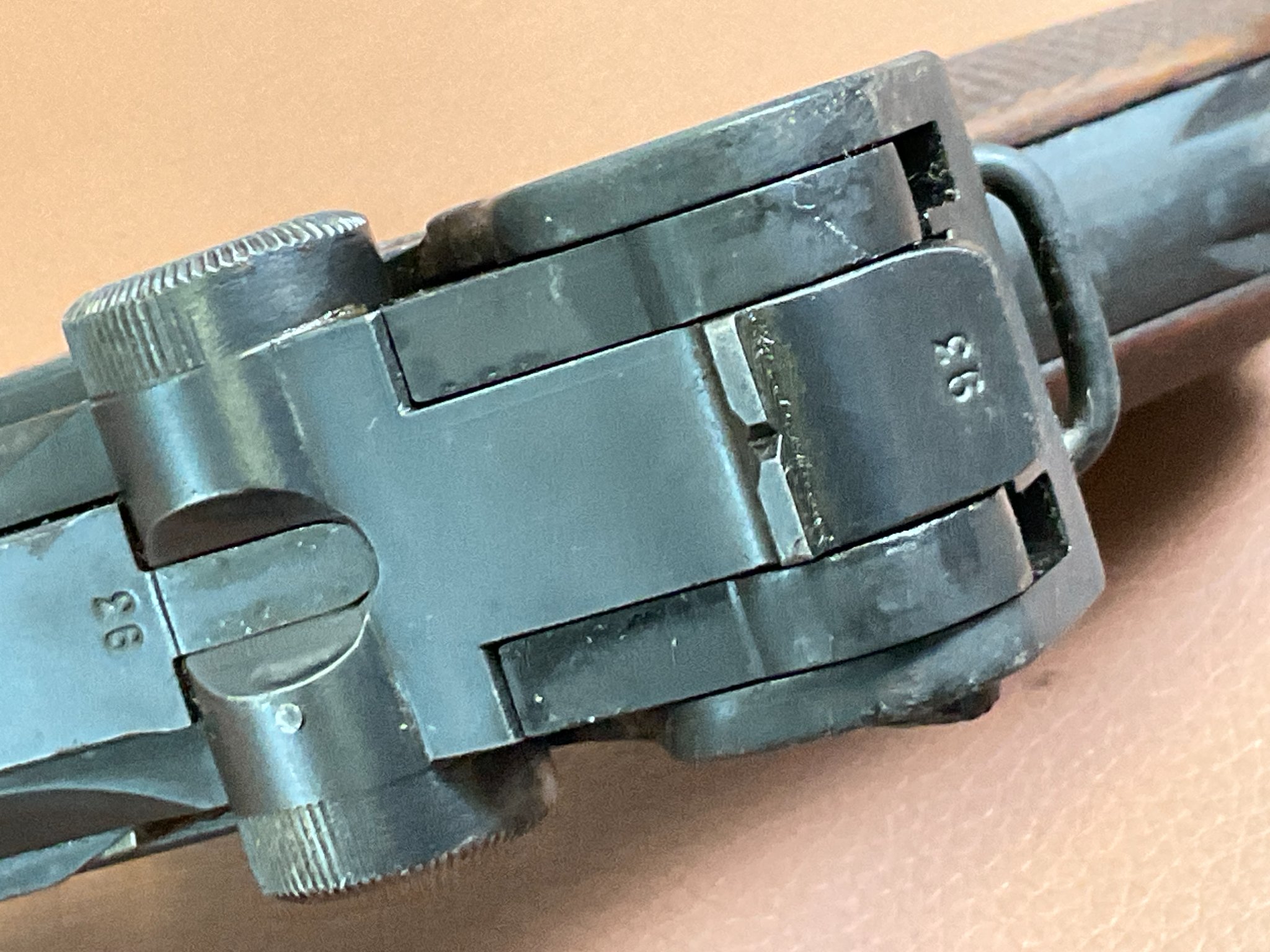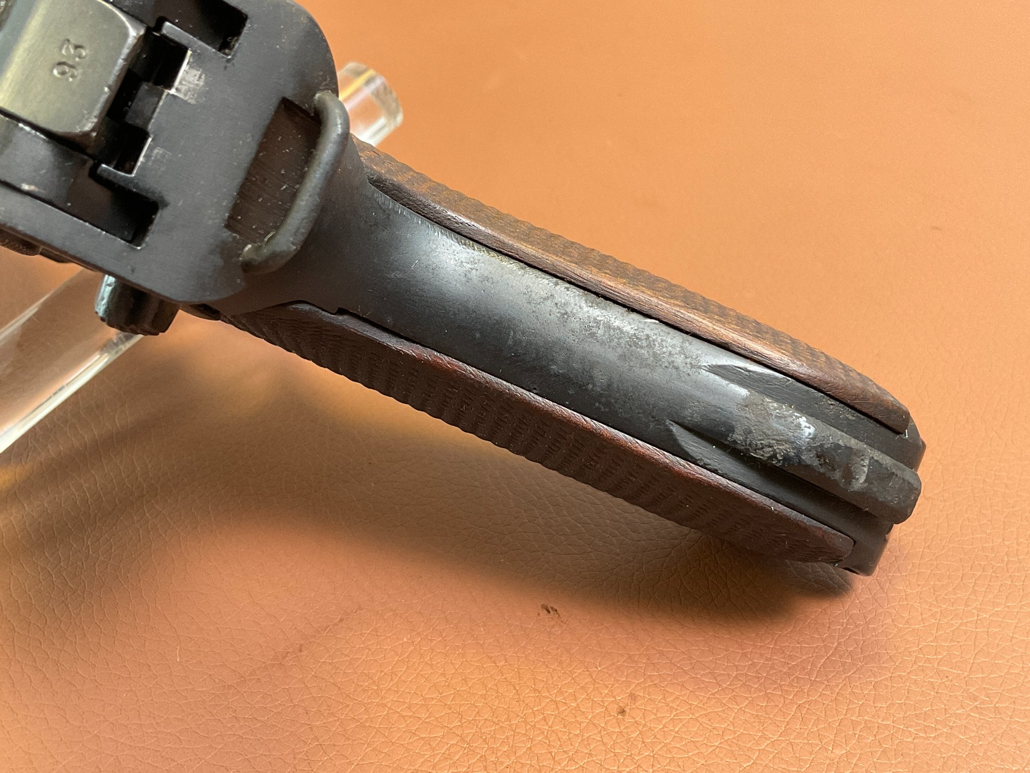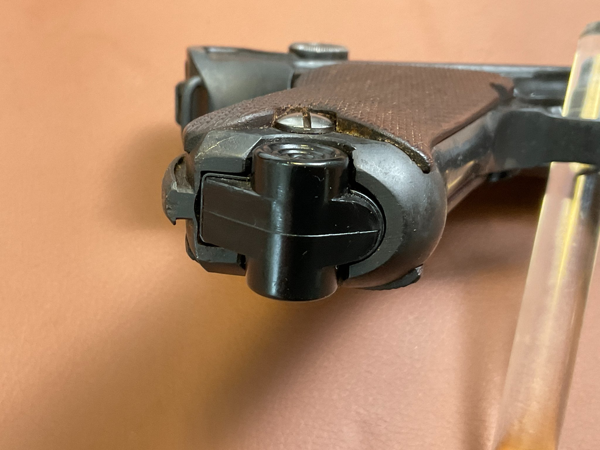 Die Waffe wurde neu brüniert. Griffschalen und Magazin sind Nachkriegsfertigungen.