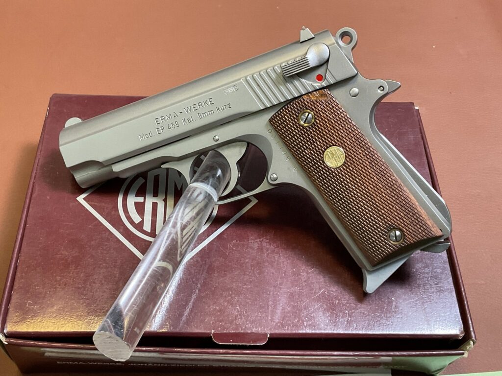 Zum Verkauf steht eine Pistole der Firma Erma, Modell EP459 im Kaliber 9 mm kurz (.380 ACP), in Stainless-Ausführung.