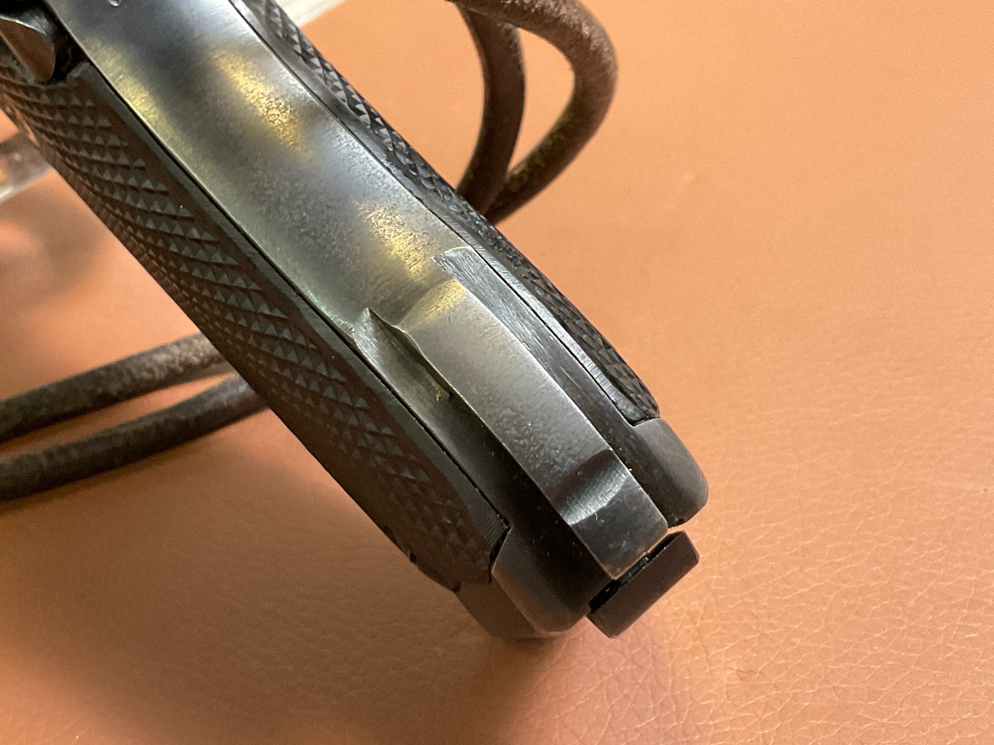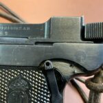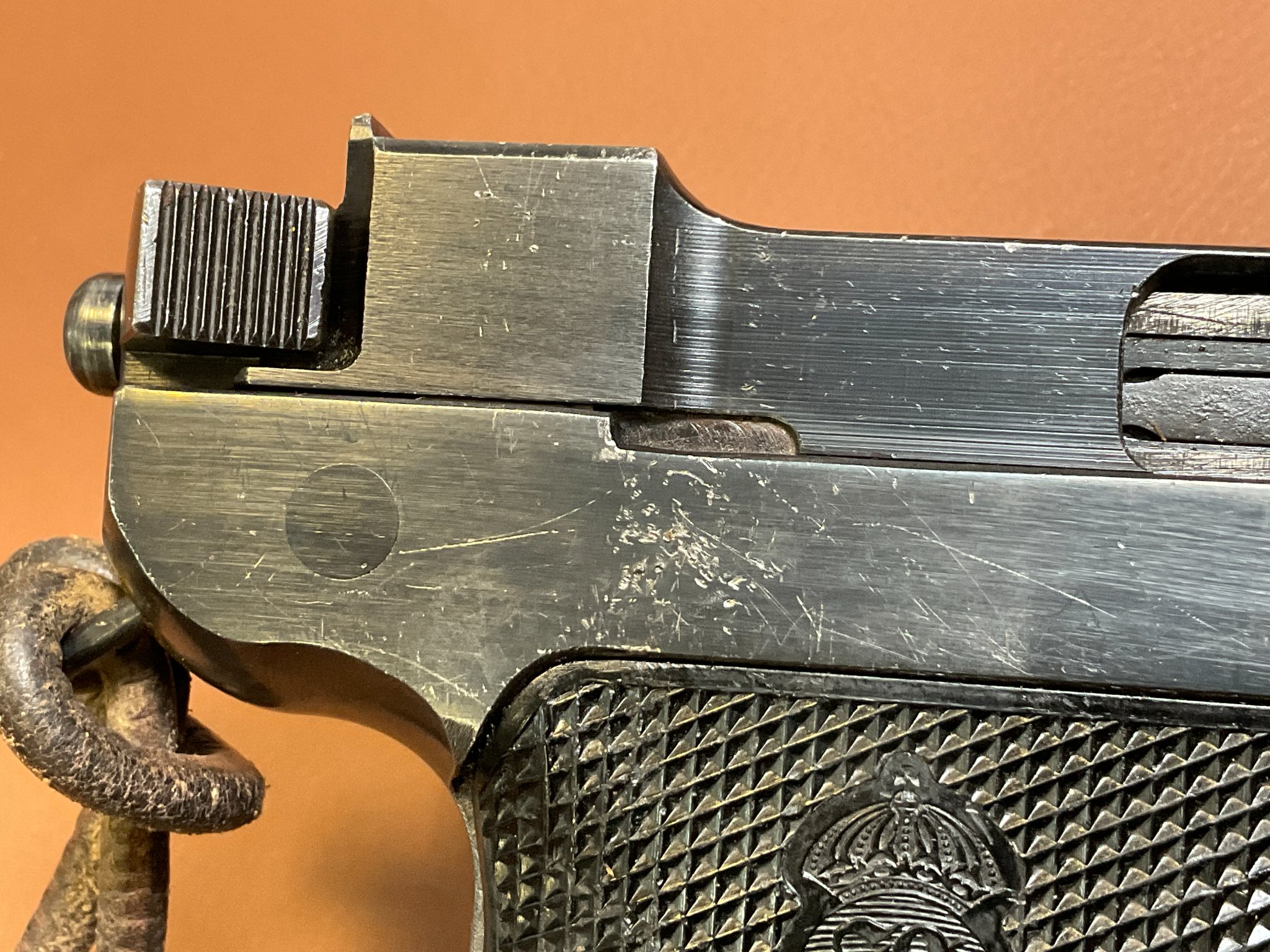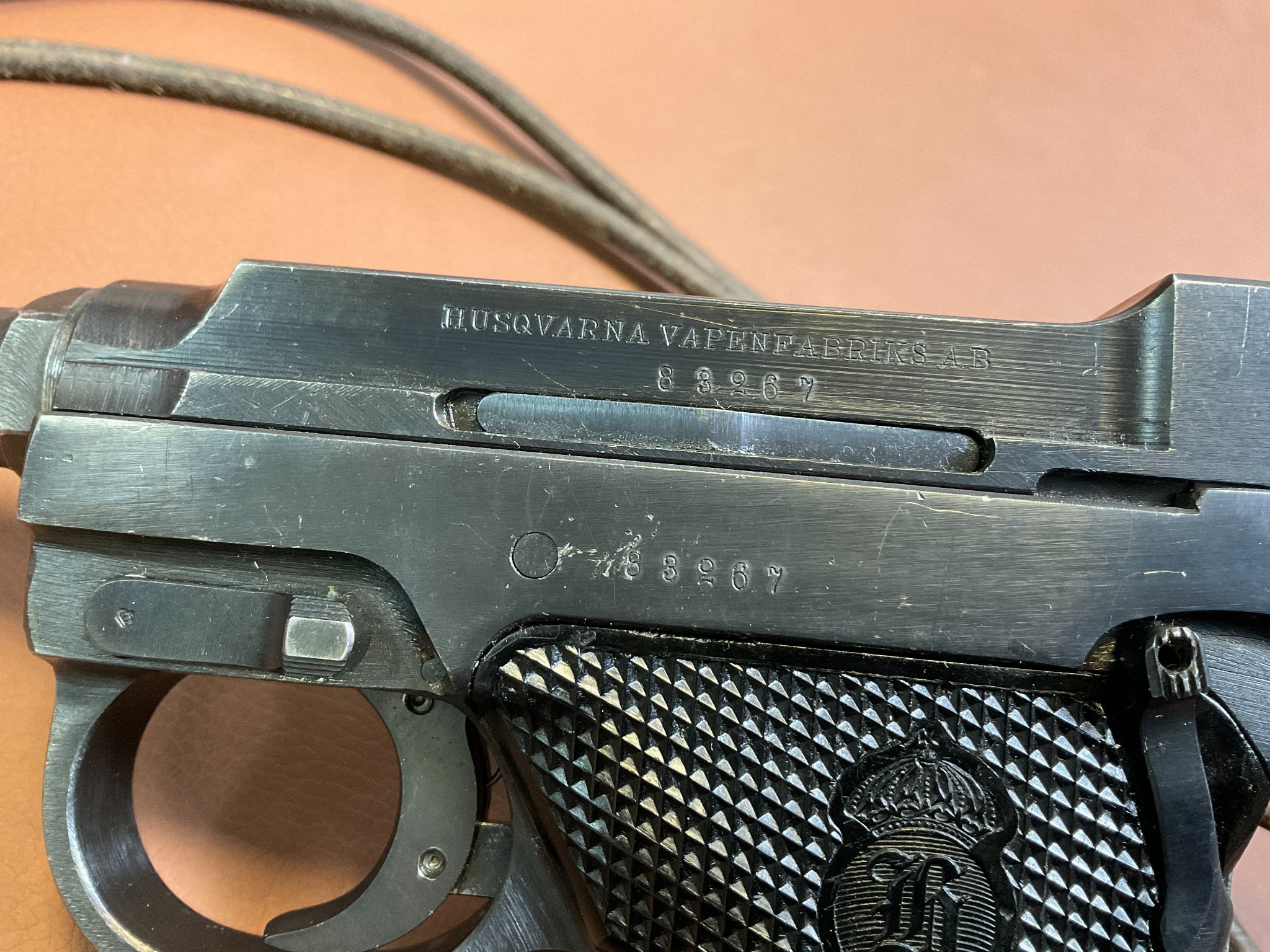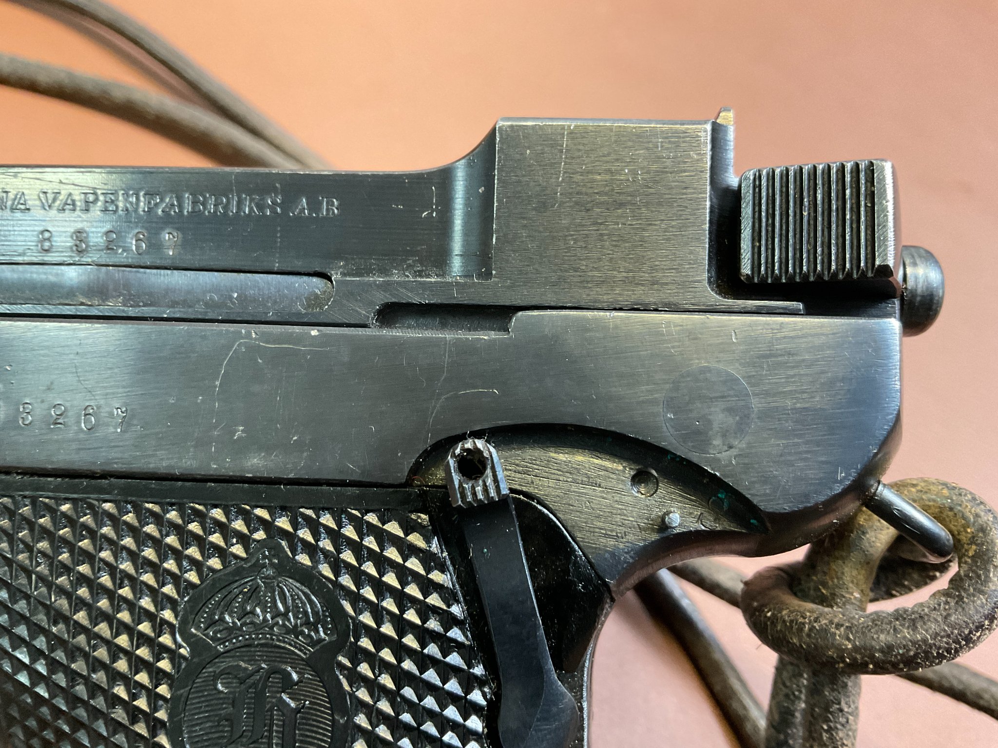 Zum Verkauf steht eine schwedische Militärpistole der Firma Husqvarna, Modell M40, im Kaliber 9 mm Luger. Beschuss Adler N. In originaler Pistolentasche mit Ersatzmagazin, Putzstock, Schraubenzieher und Fallriemen. Guter Zustand mit Handhabungs- und Tragespuren; leichte Verfärbungen der Brünierung am Lauf. Lauf innen spiegelblank, Züge und Felder sehr gut erhalten.