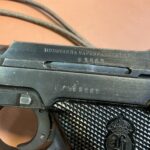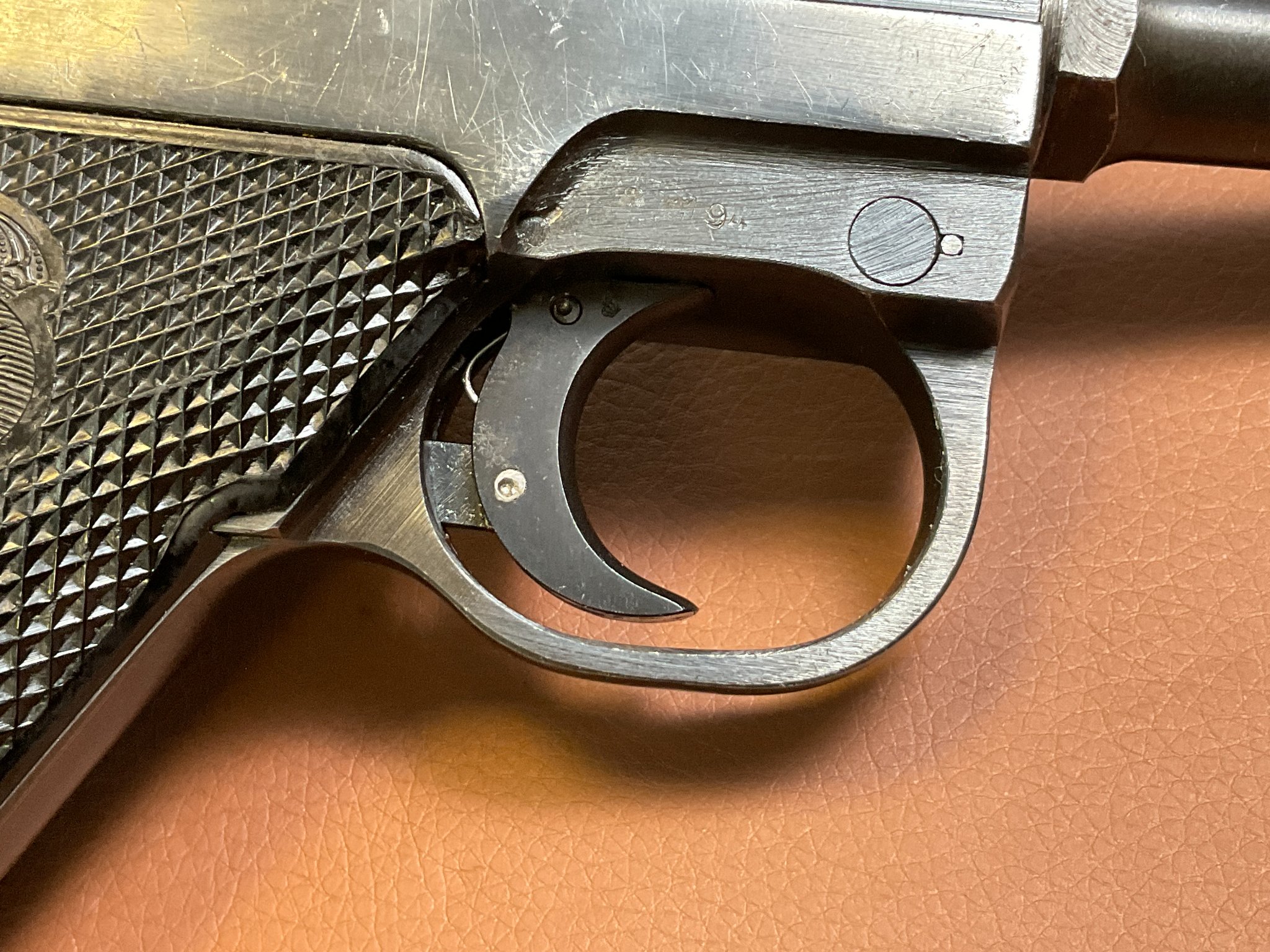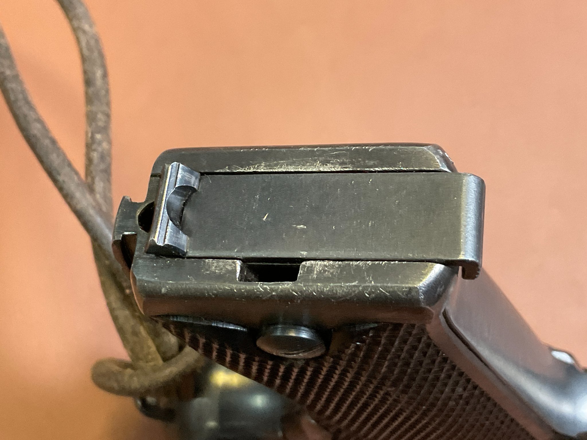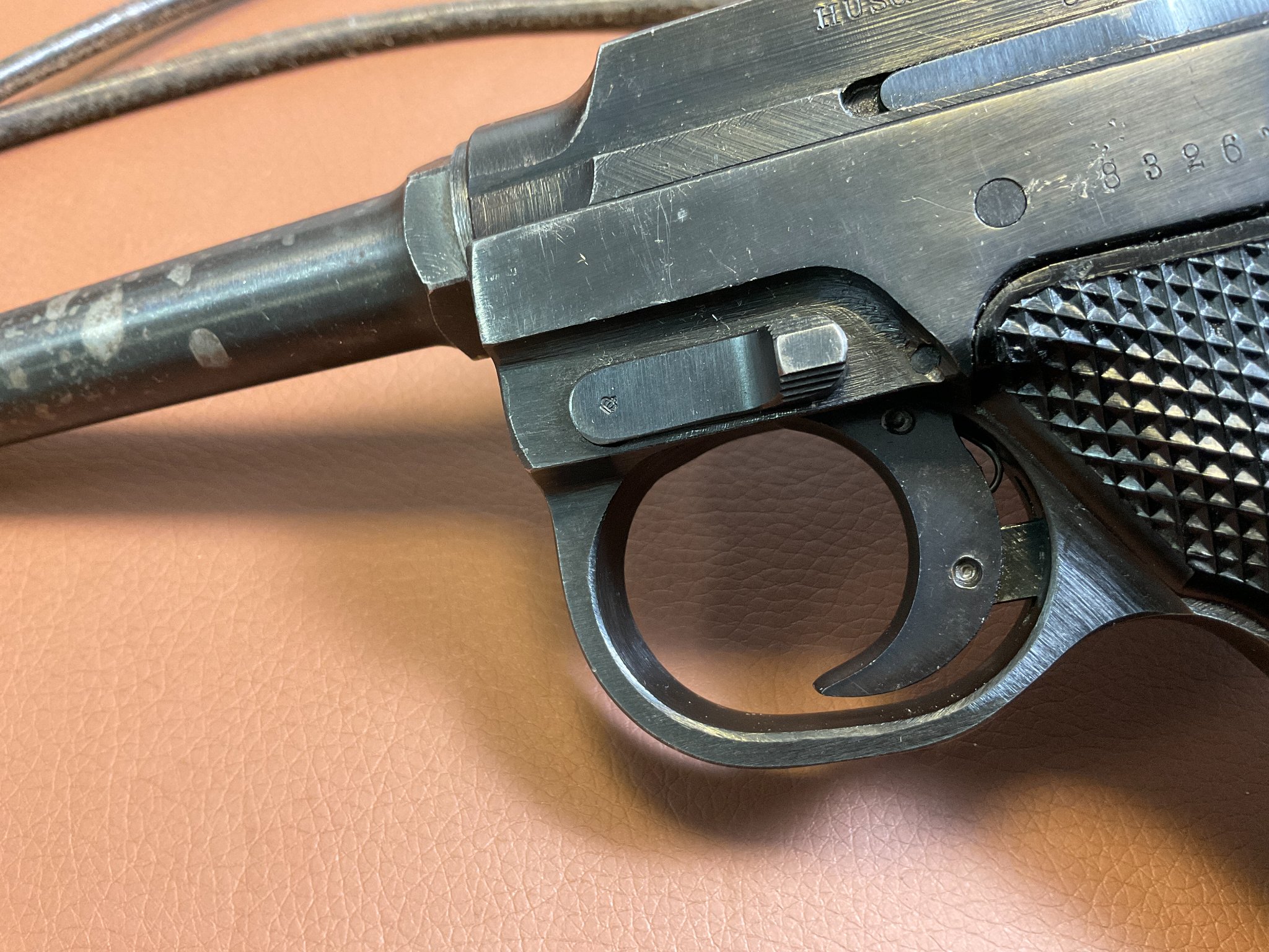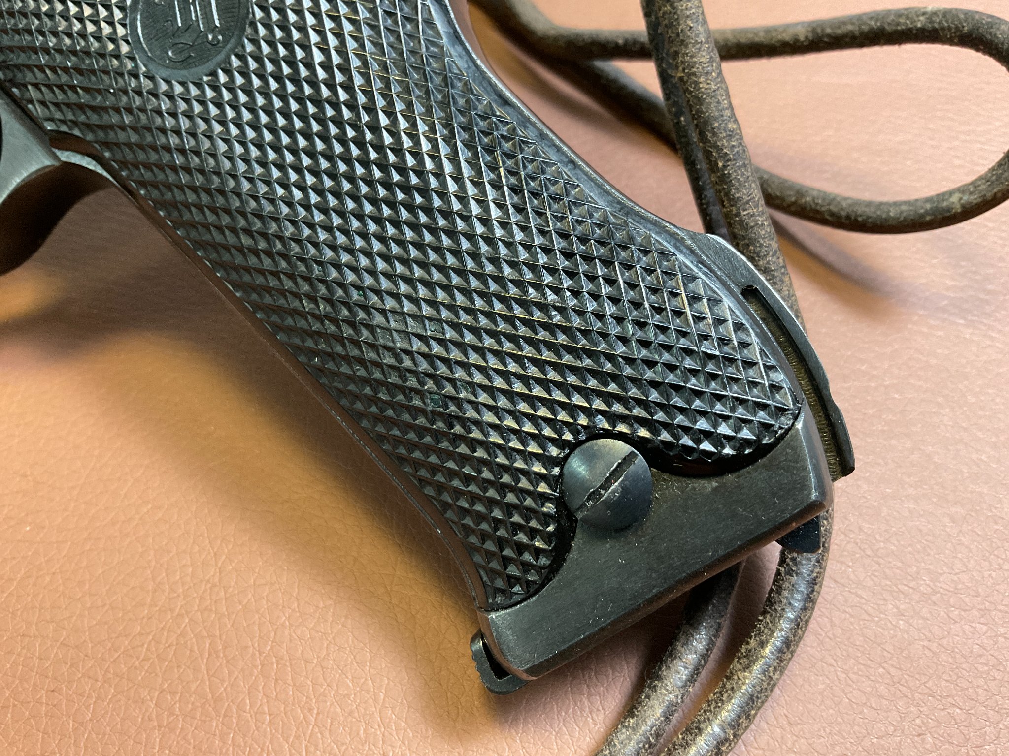 Zum Verkauf steht eine schwedische Militärpistole der Firma Husqvarna, Modell M40, im Kaliber 9 mm Luger. Beschuss Adler N. In originaler Pistolentasche mit Ersatzmagazin, Putzstock, Schraubenzieher und Fallriemen. Guter Zustand mit Handhabungs- und Tragespuren; leichte Verfärbungen der Brünierung am Lauf. Lauf innen spiegelblank, Züge und Felder sehr gut erhalten.