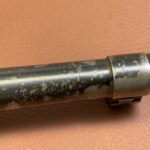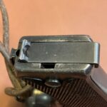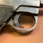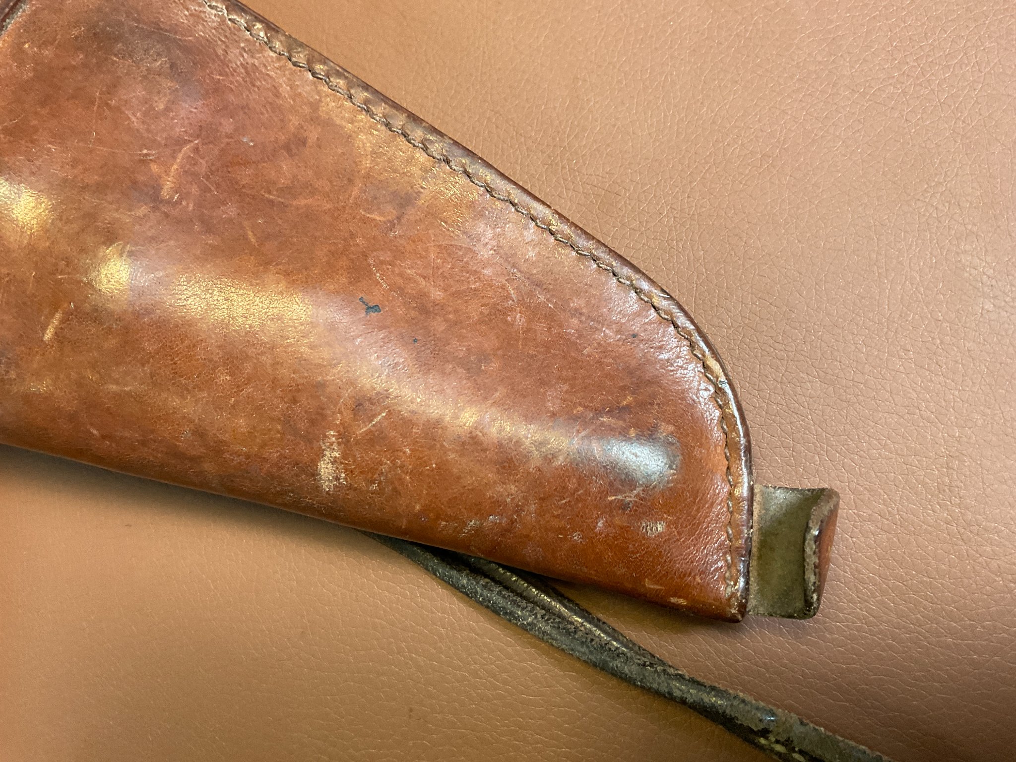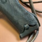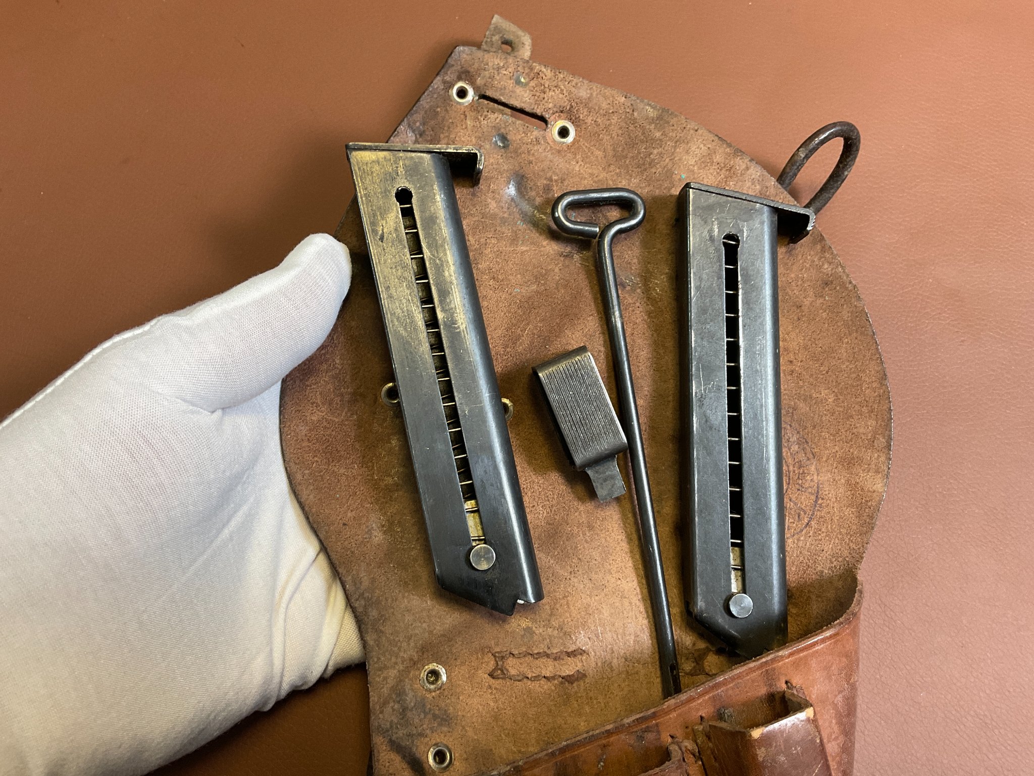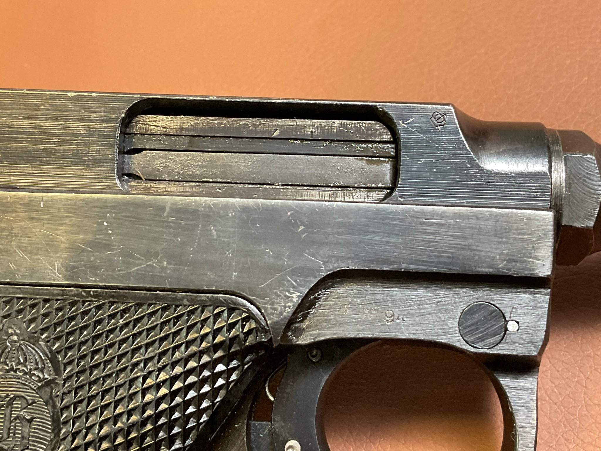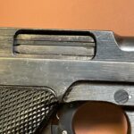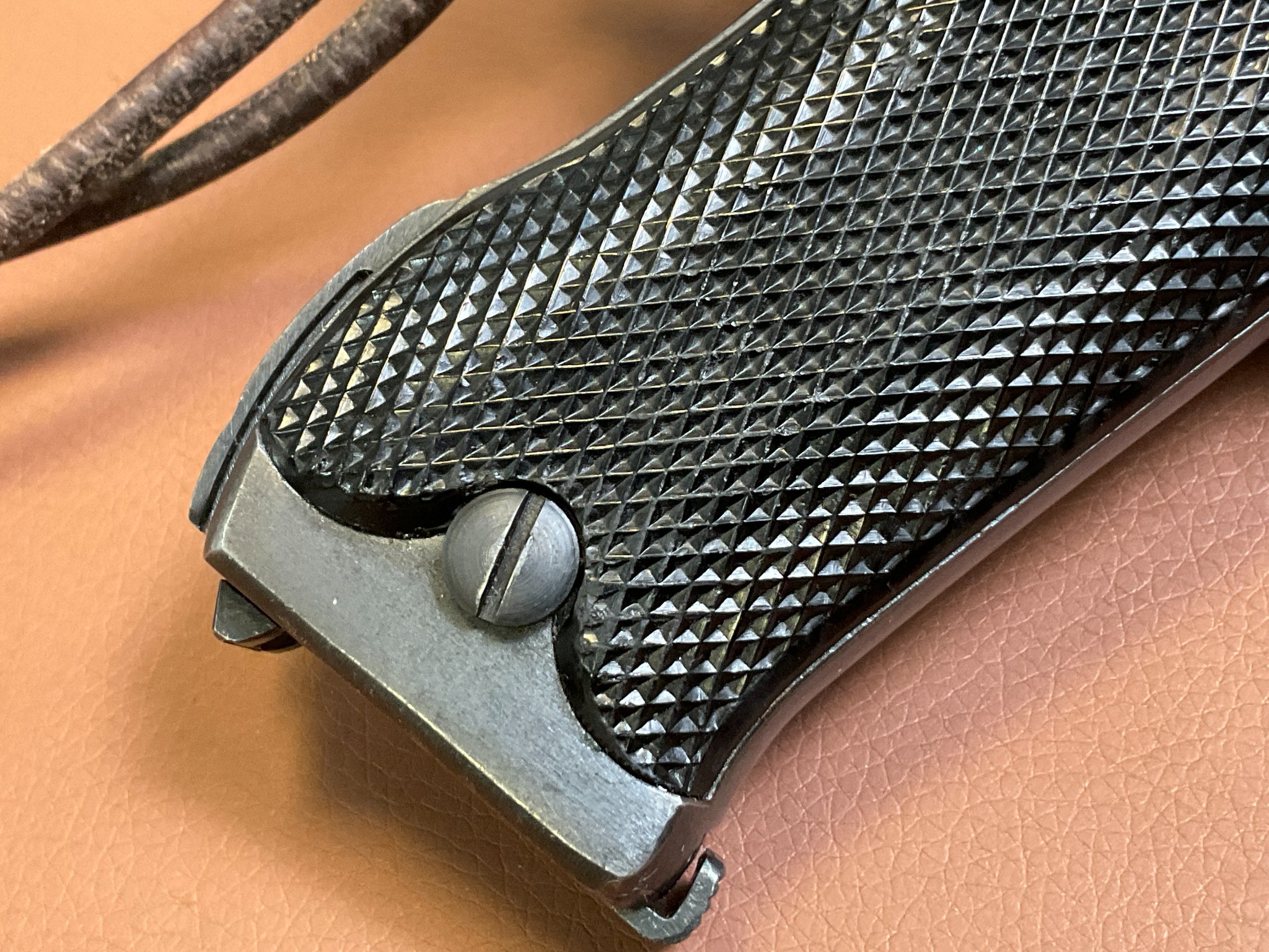 Zum Verkauf steht eine schwedische Militärpistole der Firma Husqvarna, Modell M40, im Kaliber 9 mm Luger. Beschuss Adler N. In originaler Pistolentasche mit Ersatzmagazin, Putzstock, Schraubenzieher und Fallriemen. Guter Zustand mit Handhabungs- und Tragespuren; leichte Verfärbungen der Brünierung am Lauf. Lauf innen spiegelblank, Züge und Felder sehr gut erhalten.