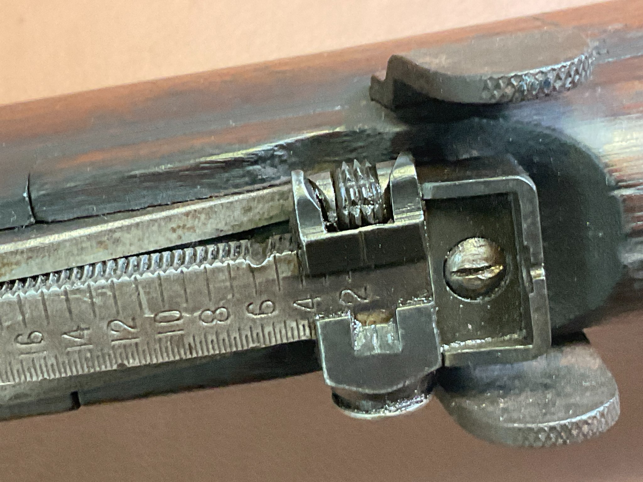 Das Visier wurde in den 1970er‑Jahren blockiert, was zu dieser Zeit eine gesetzliche Vorgabe war. Der Lauf ist blank, Züge und Felder sind sehr gut erhalten.