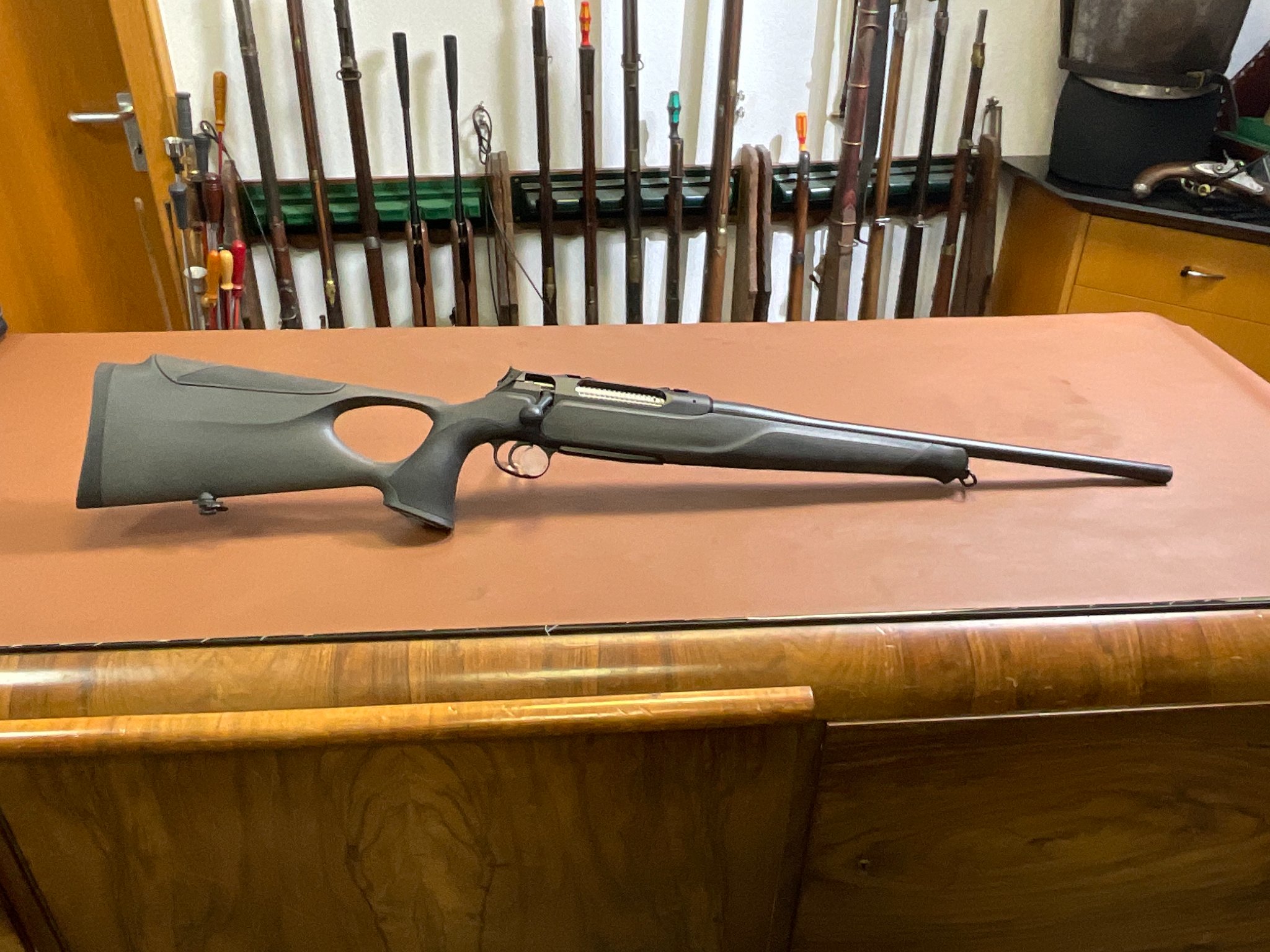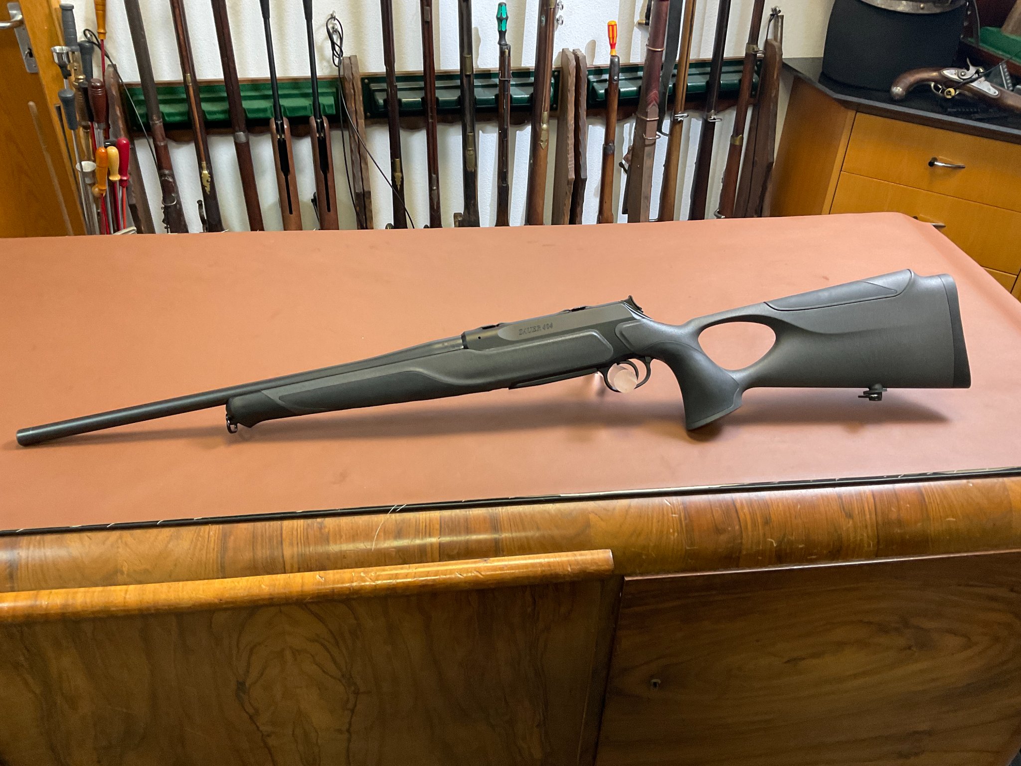 Zum Verkauf steht eine Repetierbüchse Sauer 404 Synchro XT im Kaliber .308 Winchester, in gepflegtem Zustand aus Geschäftsauflösung. Ausgestattet mit ergonomischem Kunststoff-Lochschaft, Wechselmagazin, Handspannersystem, Laufgewinde (M15x1) sowie präzisem, einstellbarem SAUER Quattro-Abzugssystem. Auf der Montageschiene sind leichte Abdrücke erkennbar, was auf eine vormals montierte Optik schließen lässt.