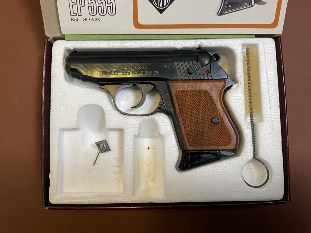 Zum Verkauf steht eine Taschenpistole der Firma Erma, Modell EP555, im Kaliber 6,35 mm Browning (.25 ACP).